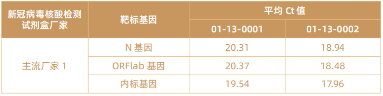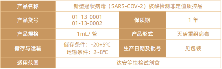 能匹配市场上主要新冠病毒核酸检测试剂盒,包括但不限于达安、圣湘、明德、之江、硕世等在内的试剂盒。取200μL质控品提取核酸后,采用达安快检试剂检测01-13-0001或01-13-0002,结果如下: