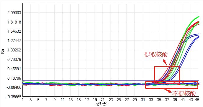 使用DNA聚合酶扩增由本产品提取过的质控品核酸样本,无荧光扩增信号,实验结果如下: