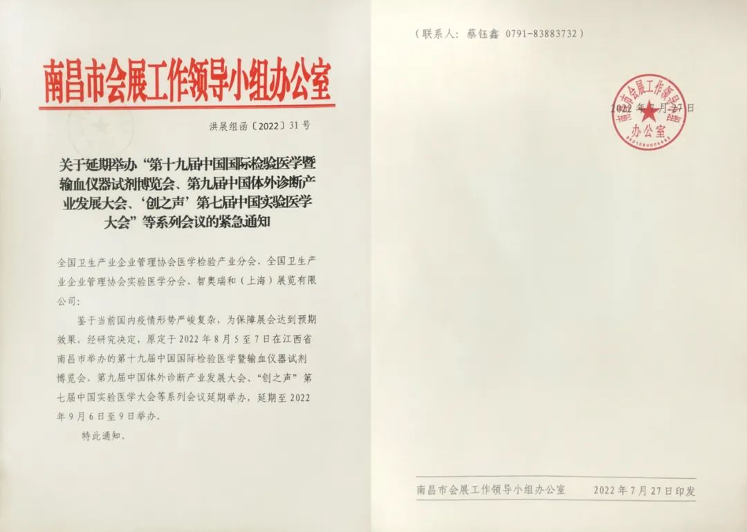 鉴于目前南昌疫情出现的新情况新形势,为配合南昌市人民政府疫情防控工作,切实保障广大参展企业和业界朋友们的健康安全及良好的展会、会议效果,经主承办方与南昌市人民政府有关各方商定:原定于2022年8月4日-7日举办的:第十九届中国国际检验医学暨输血仪器试剂博览会,第二届中国国际IVD上游原材料制造暨流通供应链博览会,第七届“创之声”中国实验医学大会暨相关论坛,第九届中国体外诊断产业发展大会暨相关论坛延期至2022年9月6日-9日(9月5日-6日布展)举行。届时源景泰科依旧在B2-2513展位与大家见面。
